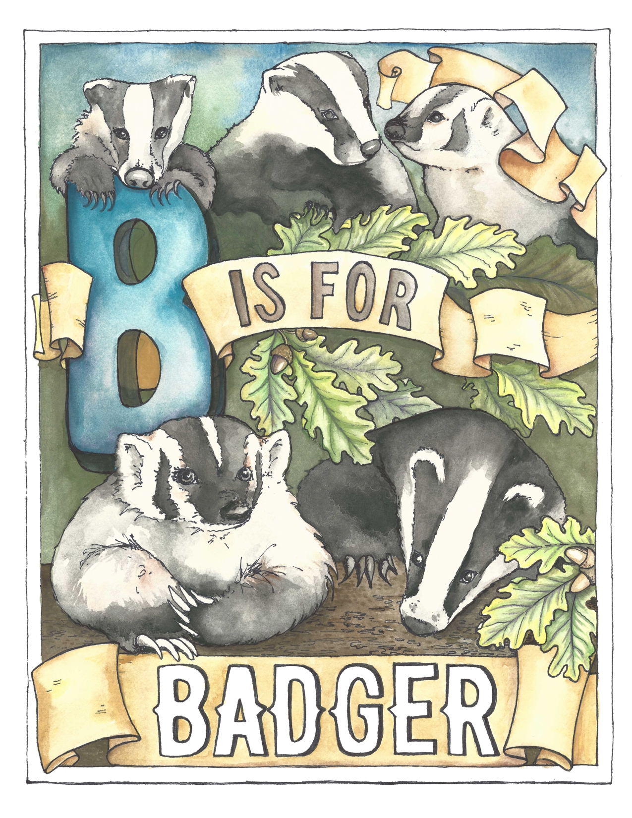 Print of 8×10 B is for Badgers on archival watercolor paper, UV colorfast ink.